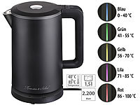 Un véritable atout dans votre cuisine : Avec son design moderne, la bouilloire à double paroi s'intègre avec élégance dans toutes les cuisines et sur la table dressée. Grâce à son boîtier isolant en plastique sans BPA, la surface de la bouilloire reste touchable même pendant l'ébullition. L'intérieur est entièrement en acier inoxydable. Le petit plus : l'éclairage LED change de couleur en fonction de la température de l'eau ! Vous savez ainsi à tout moment à quelle température se trouve l'eau.